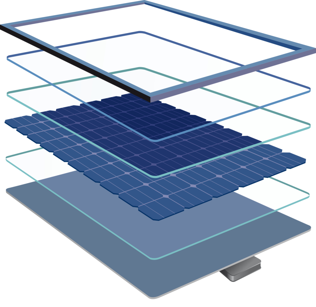 A solar panel consists of 7 key layers: the top tempered glass protects against weather, the front EVA encapsulant cushions the cells, the silicon solar cells generate electricity, the back EVA encapsulant secures the cells, the backsheet provides insulation, the junction box enables electrical connections, and the aluminum frame gives strength and durability.